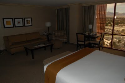 I checked in asking for a room with a view, but was instead given one generally with parking lots; only a sliver of the mountains showed to the west. Disappointment instantly set in, since I was hoping to see the bright lights of the Strip and be able to take a great panoramic photo of all of the hotels. This feeling of disappointment stayed with me throughout my stay with the exception of my time spent at different hotel restaurants.