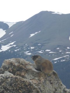 the Alpine Visitor’s Center though, there’s a half-mile hike that goes up to the top of a nearby peak, literally taking your breath away as you climb, maxing out at 12,005 feet, or 2.3 miles, above sea level. And at the top of that trail we found a little marmot happily eating away at some grass in the rocks.