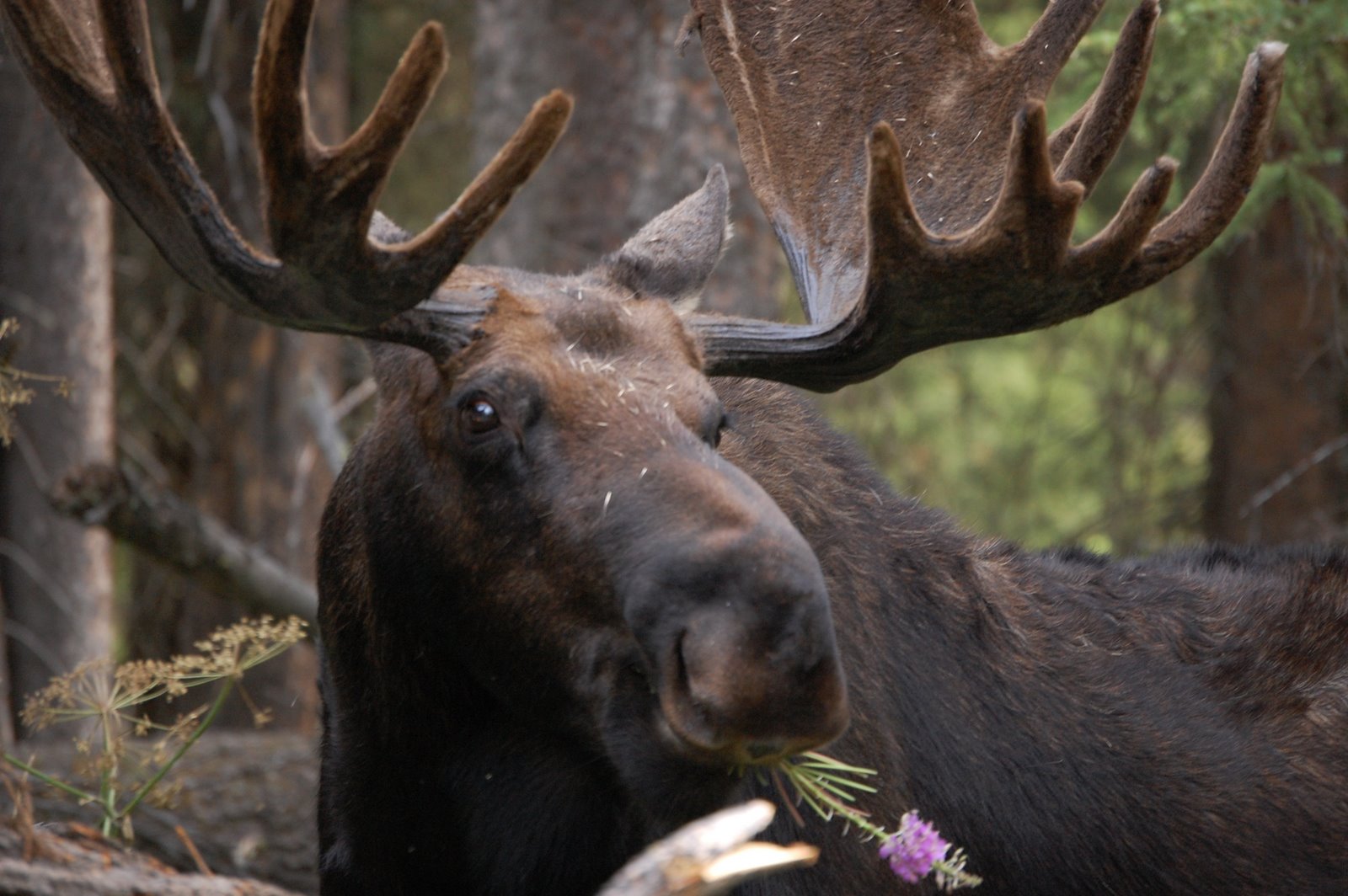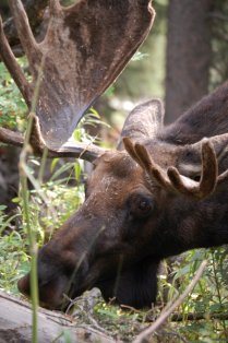 I drove the road twice seeing absolutely nothing, but finally, on my third try, I came across a bull moose sitting the trees relaxing and have a bit of a snack.