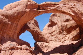 thousands of years from now.The view of the Double Arch was amazing in the cloudless day. I was quite impressed with it, even to a point of reverence, and sat there for a good while admiring it. Some people were climbing up under the arch, off where the trail ends, which rather bothered me as it made a picture difficult and seemed to be a bit disrespectful of the beauty. Of course there are no signs saying you can’t climb up there, so I don’t think it’s against the rules, but I was annoyed by it nonetheless as even slight damage from many visitors can cause problems for future ones.