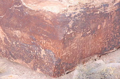 Shrugging at what I had seen, trying to feel impressed, I climbed back into my car and continued south. I took the very next pulloff, hoping to find anything – anything at all – that could make me happy. My guidebook, retrieved from the back seat, said the Newspaper Rock was quite possibly the most impressive location in the national park.