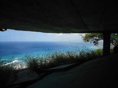 It wasn’t long before I came to pair of staircases – separated only by a dark, cramped tunnel – with a total of 225 steep, narrow, and sometimes winding, stairs. The view was worth all of the stooping and wedging between the handrailing and other tourists I had to do, though, as I discovered the reason for Diamond Head’s popularity from inside the uppermost emplacement: