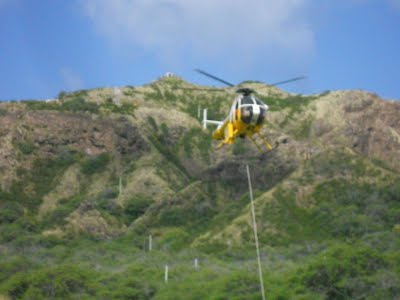 As I appeared from the Kahala Tunnel, I could see a helicopter carrying a load on a rope far below its rotating blades; it was just beyond the toll booth where I was turned away. Someone had to be rescued from the trail, likely due to heat exhaustion, as another hiker speculated. It didn’t seem all that hot out yet, at least not to me, and the wind offered a lovely cooling effect. But, everyone takes trails different ways and it is completely likely they turned an ankle and were unable to walk down.