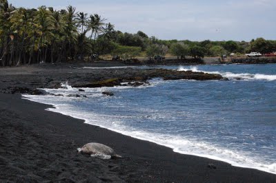 The pair paddled by a mesmerized crowd on the submarine, each person jostling to get a photo as the captain positioned the ship for everyone’s delight. I was near to the point of being giddy at seeing another sea turtle on my return. I had anticipated having no luck at any wildlife, since I was spending my stay around the very busy Waikiki Beach. But, luck favored me and I left Oahu for the Big Island excited for the possibilities at such places as the Pu’uhonua o Honaunau National Historic Park and at the Punalu’u Black Sand Beach.