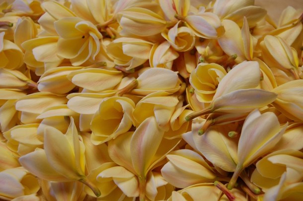 I was making a real Hawaiian lei from a pile of plumeria flowers covering the table in front of me. They were piled high, more than enough for us to string several lei together without running out. But we had walked the dusty field surrounding the office building to pick out a handful of different colors. It was easy work, picking the flowers, but tiring under the hot Hawaiian sun. No one complained, though; we were on Molokai partaking in one of the loveliest of Hawaiian traditions at the Molokai Plumeria Farm.