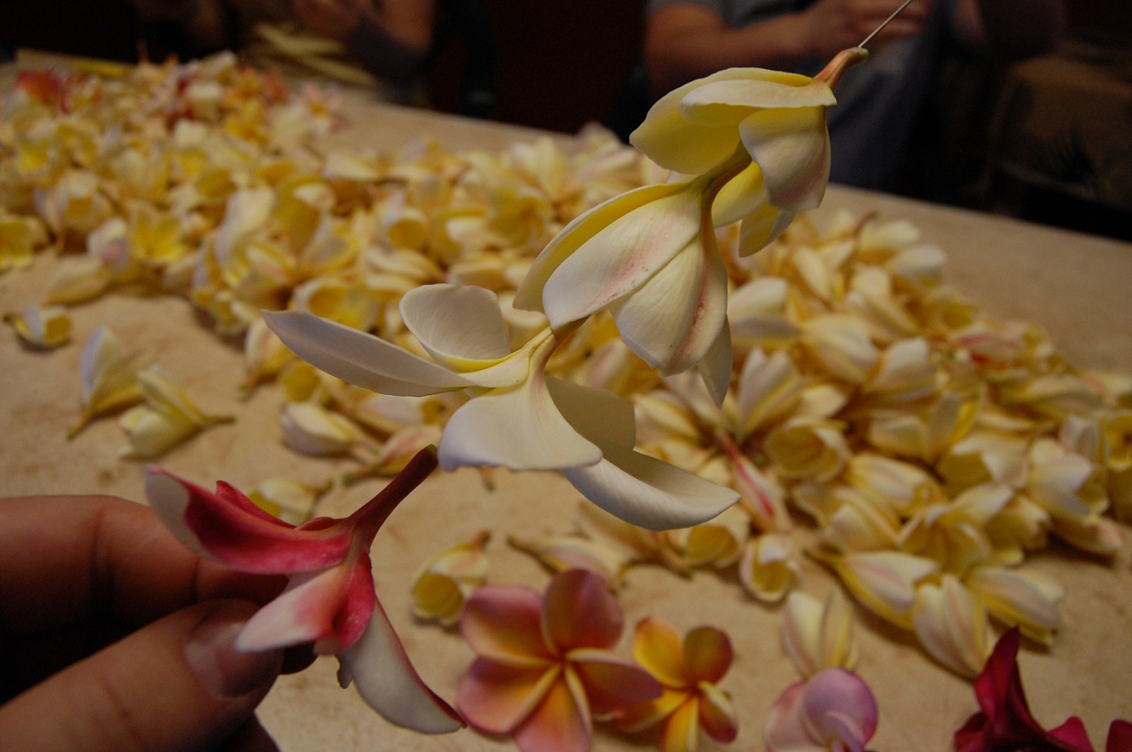 I jabbed through the flowers exiting at the stem. One by one I stuck them with a giant needle. Only when there were four flowers on the needle did I grasp and slide them down onto an attached string. I had anticipated it to be a difficult and delicate process, but creating my lei was easy.
