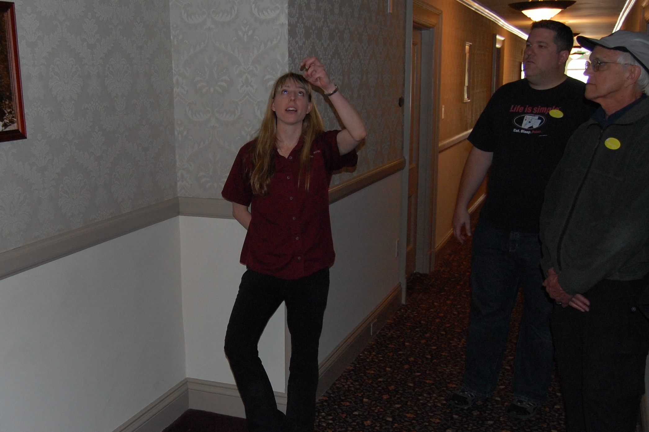 Hiding behind the door, he waited for the rest of the group to catch up. Some were straggling behind taking photos of the stairway. Listening to our guide from Room 217, he stood silently, waiting, stalking his prey. Unfortunately no one would bite. No one would approach the door for our practical joke. They all instead just shrugged and walked off, continuing on up the stairs with the tour, after our guide was done with her explanation of the area.