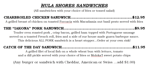 I was honored by the naming, but was truthfully concerned it would be a hit with the Hotel Molokai’s guests. I didn’t want the sandwich to be a flop, not just to placate my ego but because Gene was so excited about it. But just a couple of days after putting it on the menu, I received an excited note from Gene saying the first person to order it was a 65-year-old lady who said, “its kinda messy, but really good.”