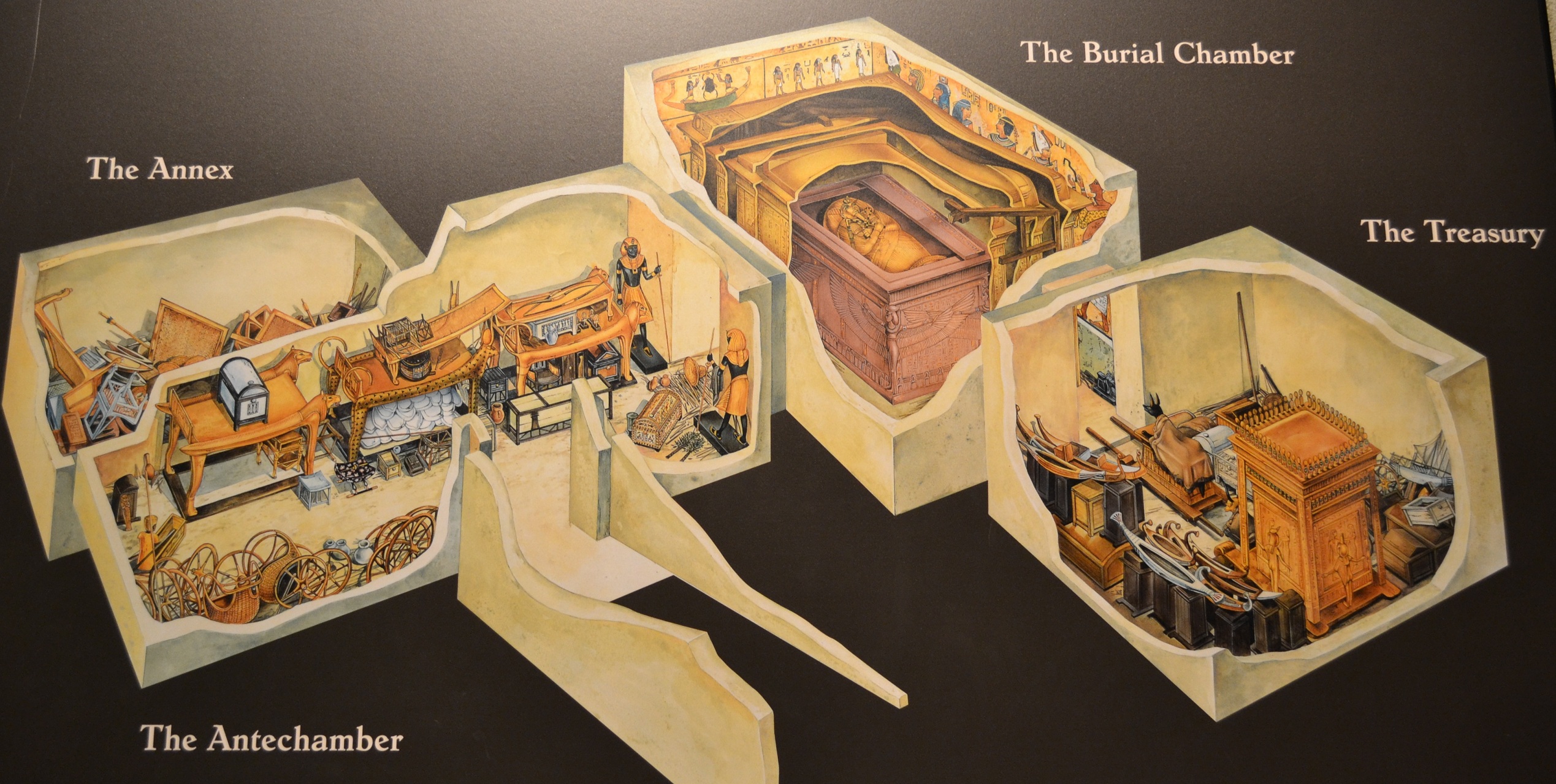 After going through and admiring dozens, if not hundreds, of items, King Tut finally presents himself. Upstairs, at the top of a long ramp, the headline attraction finally begins with an explanation of King Tutankhamun’s tomb and how it was found by Howard Carter. From there the guest is prepared and understands what is on display and in what order – the antechamber, the burial chamber, the treasury, and the annex.