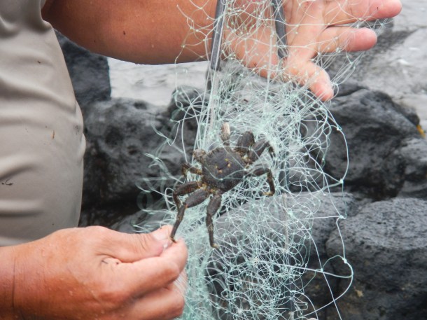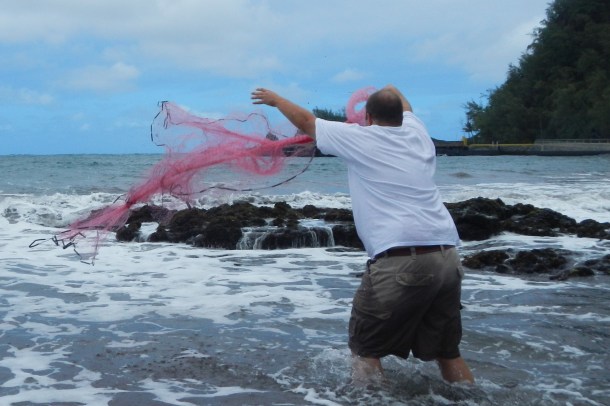 It all started with patience. I saw how fast Andrew Park did it and I thought I should be able to do it just as quickly. Then we’d be done and I could go off to see more in charming little Hana. But whoa big fella, you have to slow down, take it step-by-step, and set the net up properly so it unfurls the right way and thus catches something. This wasn’t easy to learn, since I tend to be the type of guy who starts to put things together without looking at the directions. Only after I finish do I look at the guide to see where exactly all of the leftover parts go. But with throw net fishing, I had to learn once again how to take a deep breath and accept the very blatant fact that I don’t know everything. Here’s Andrew showing how to do it…