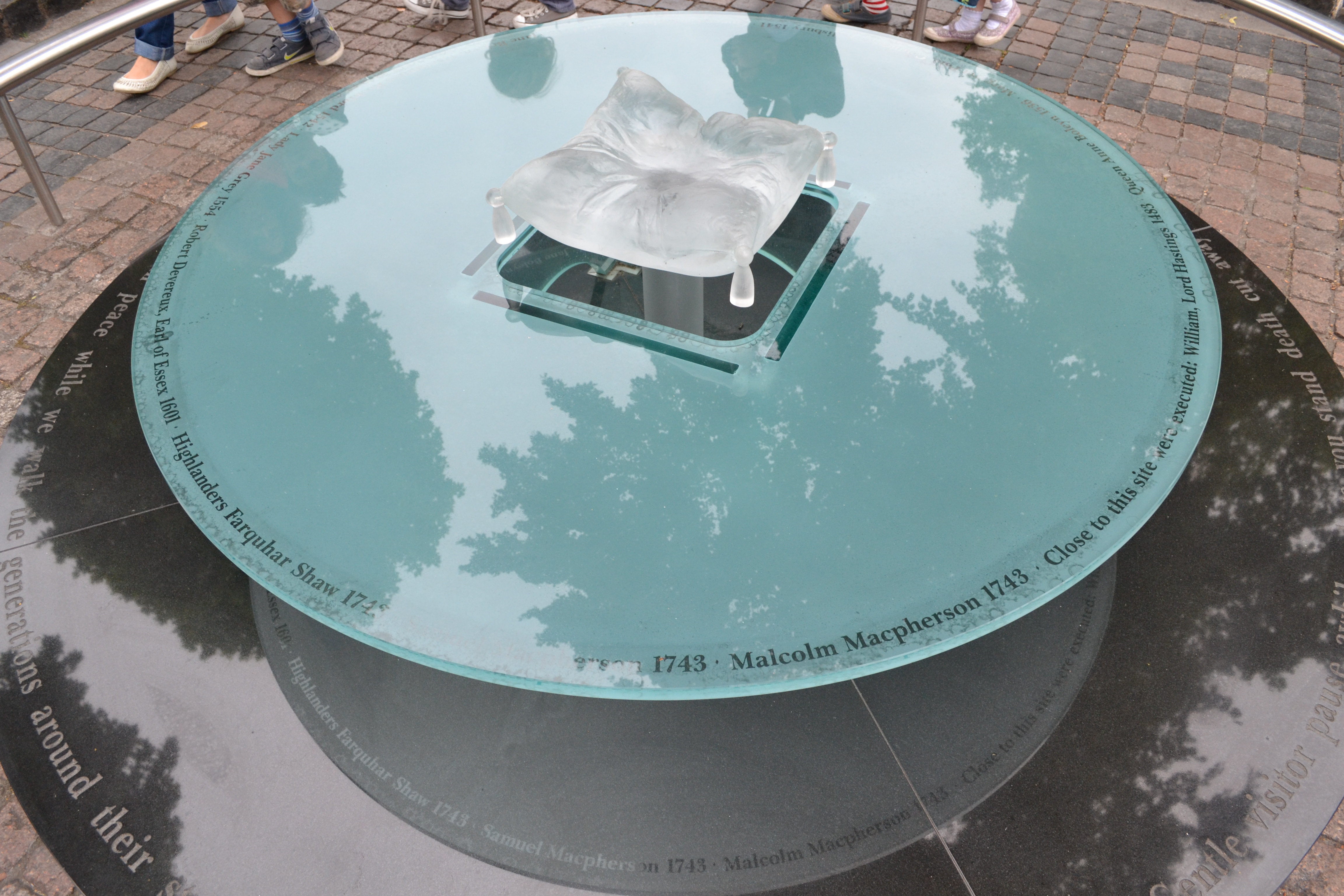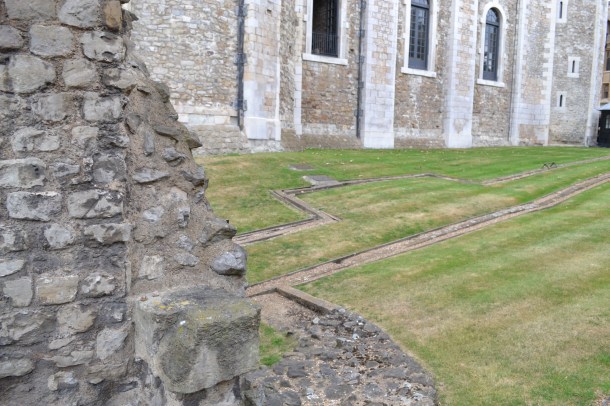 We exited the White Tower on the north side and were back at the entrance for the Crown Jewels. We had already walked around to the east and seen ruins for a wall that was built by the Romans in the second or third centuries, upon which the Tower of London was built, so we took a left and walked over to the old scaffolding site. Now marked by a crystal pillow, it was at this spot where seven prisoners were executed; 112 executions occurred outside the north wall on Tower Hill over 400 years, but those who were considered too dangerous to execute in public were put to death on the Tower Green. Today the area is a lush green plot of grass flanked on two sides by the Queen’s House, which is protected by one of the Queen’s Guards.