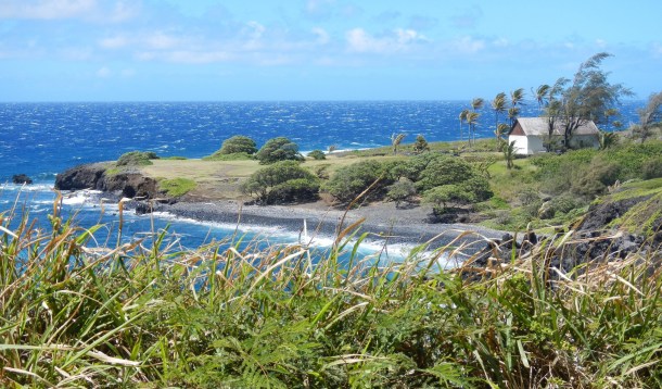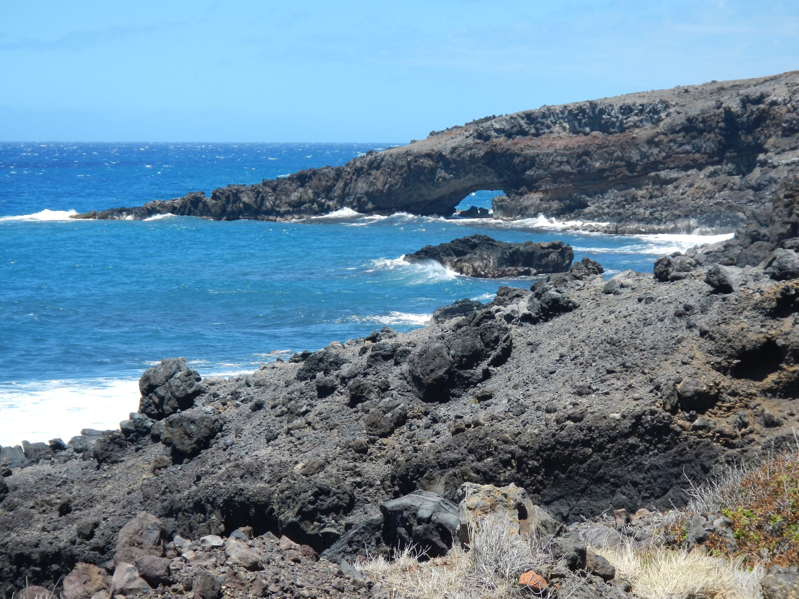 I wasn’t long down the road before the scenery dramatically changed and the rain forest-canopied road disappeared. The road was no longer what it had been, yet it was no less stunning. Actually, it was probably more beautiful simply because there was no traffic. I felt alone, as if there wasn’t another person on the road for miles in either direction. And so I passed this way past the Palapala Hoomau Church, the Huialoha Church, and Kailio Point on my way to a natural arch which can be seen from the road.