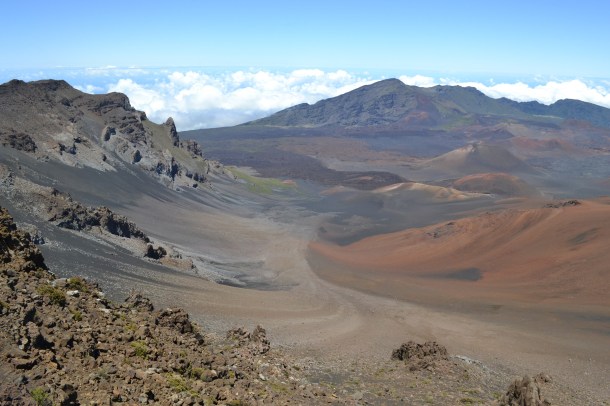 Above the white, puffy clouds on the volcano crater’s rim in Haleakala National Park on Maui.