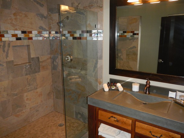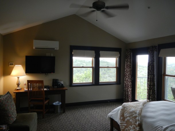 The room itself was comfortable, although nothing overly special. It wasn’t lavish, nor was it overdone. Kind of like Goldilocks and the Three Bears, it was just right. It was tastefully decorated and fitting for the atmosphere created by the surrounding tree-covered hills. And as odd as it may sound, I particularly enjoyed the bathroom; I loved the huge walk-in shower.