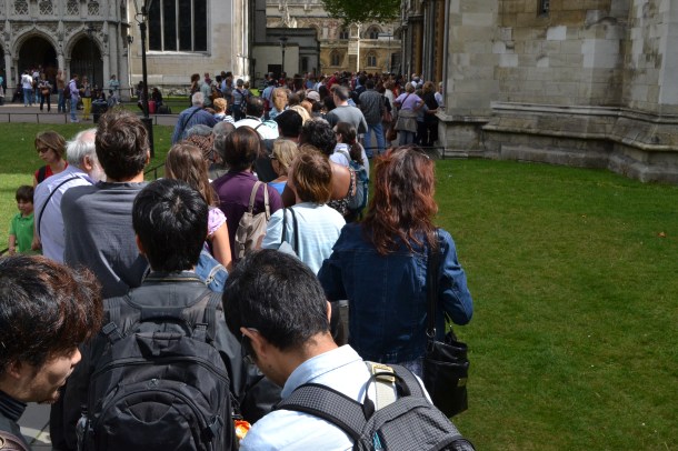 Westminster Abbey is the traditional coronation spot and burial site for the monarchs. It is also home to an obscenely slow entrance line and huge fee. As such, and since photography is not allowed inside the church, my friends and I opted to skip going inside in favor of touring a smaller chapel next door, which is free. After a quick poke around and walk through, we exited on the opposite side only to see…
