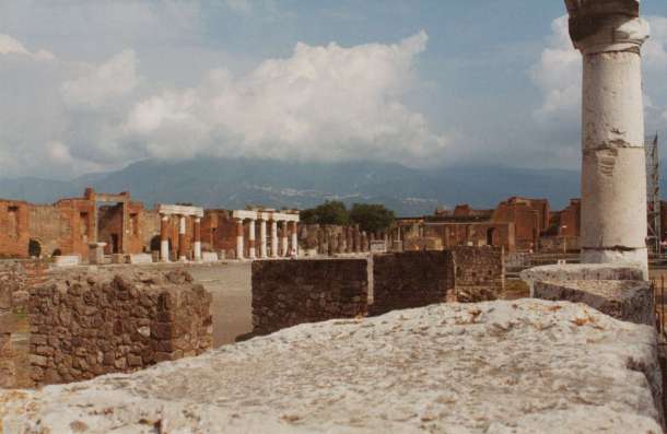Rock and ash fell from Mt. Vesuvius, looming in the clouds in the back, destroying the city of Pompeii.
