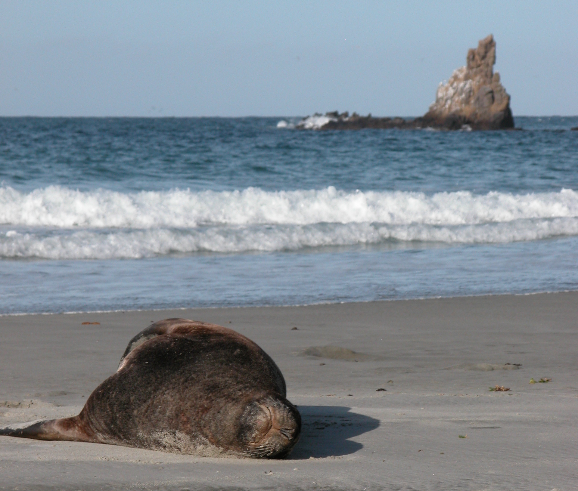 Waves crash in on the Otago Peninsula as a New Zealand fur seal sleeps.