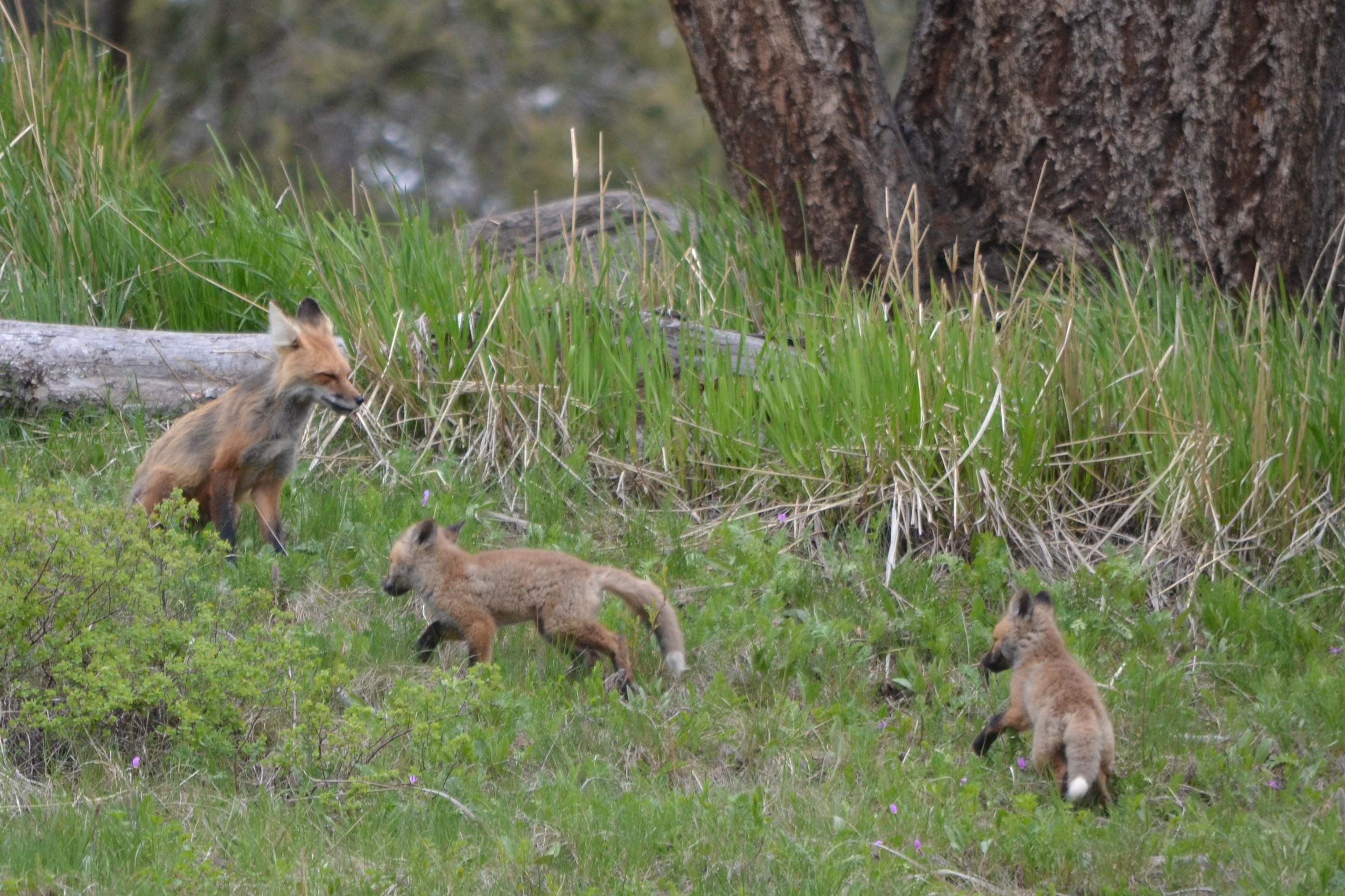 Two fox kits play near Tower Roosevelt as mom looks on.