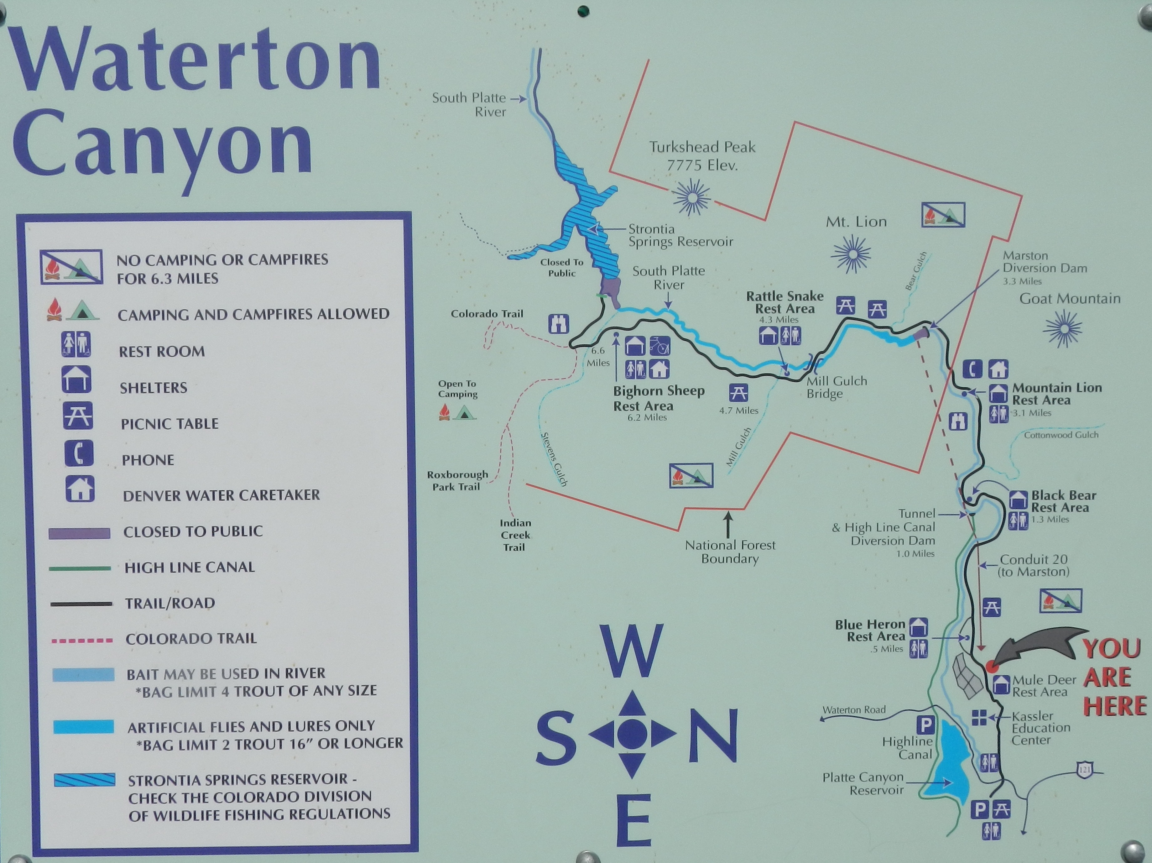 Out for the day with a friend, we discussed our goal for the hike while looking at the Waterton Canyon map at the trailhead. He was up for whatever. With a lot on my plate at the moment, I only had a few hours to spare. So I was playing the role of wimp when I told him I only wanted to go halfway into the canyon and back. He shrugged, fine with whatever I suggested, so we set out.