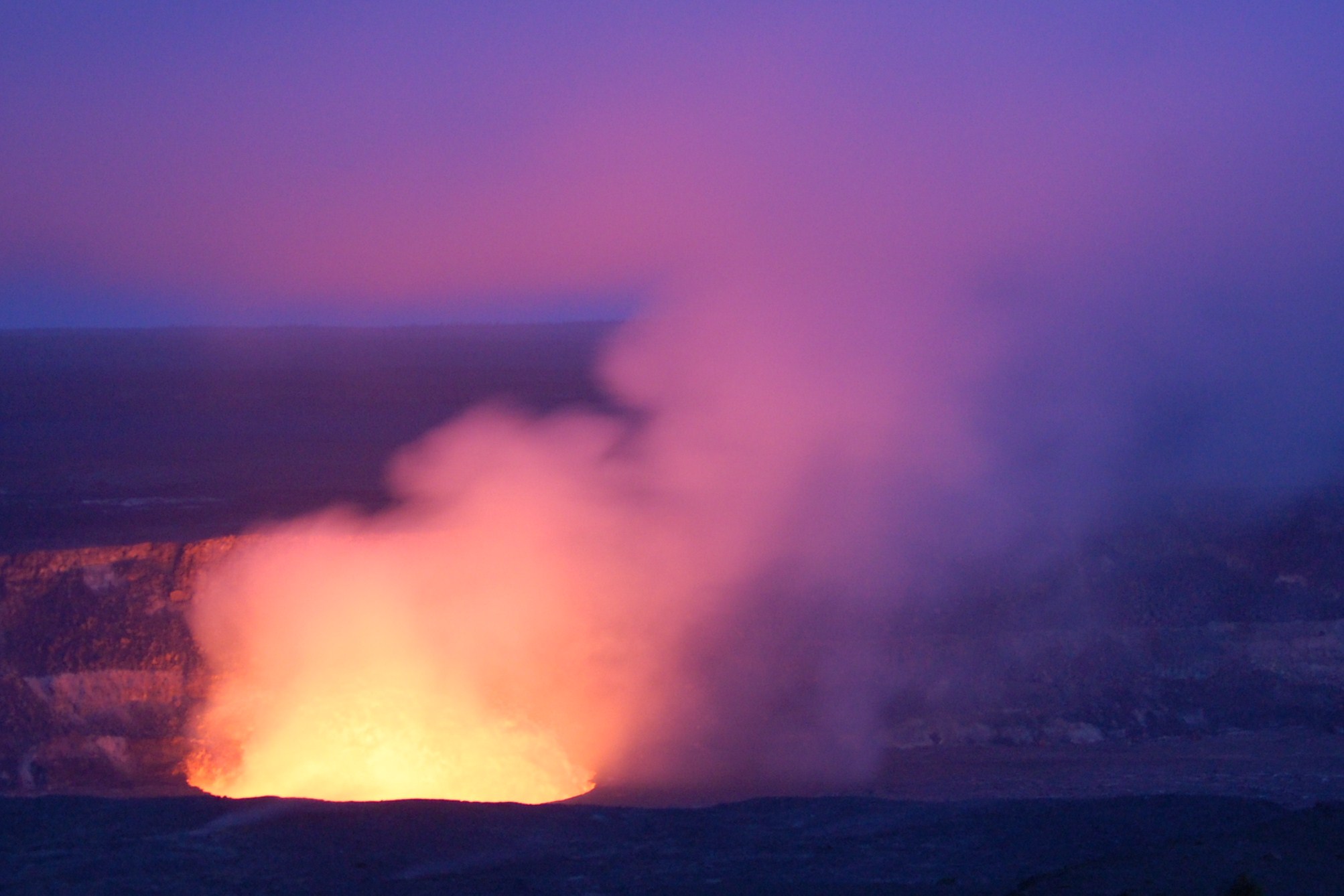 The glowing red and orange of Halema’uma’u Crater in Hawaii Volcanoes National Park at night.