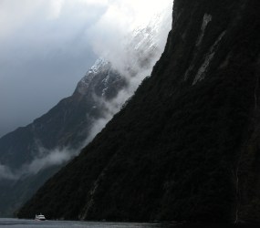 A tiny cruise ship next to Milford Sound’s massive cliffs in New Zealand’s Fiordland National Park.