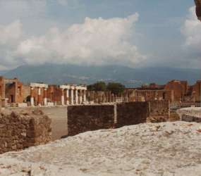 Rock and ash fell from Mt. Vesuvius, looming in the clouds in the back, destroying the city of Pompeii.