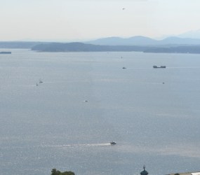 A panoramic view of a beautiful summer day on Puget Sound from the Seattle Space Needle.